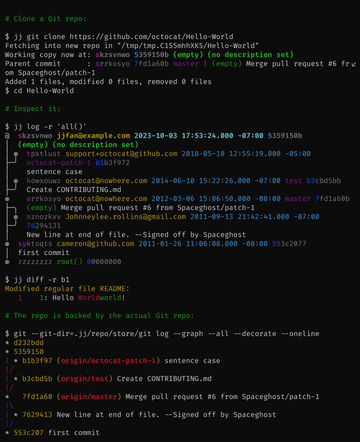 jj init --git, which is now just calledjj git init. - Oct 2023: Version 0.10.0 is released! Now includes a bundled merge and
